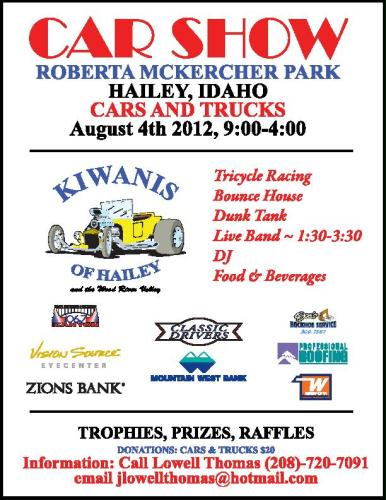 An annual car show to benefit the Kiwanis Club of Hailey will take place at Roberta McKercher Park on August 3, 2013 between 9:00 am and 4:00 pm.