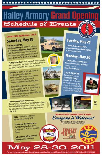 - 1:00 - 7:00 p.m. Open House at the Hailey Armory with military vehicles and equipment displays, a weapons simulator, a rock climbing wall and a bouncy house for youth.