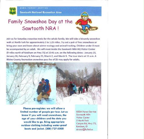 Family Snowshoe days at the Sawtooth NRA. Please pre-register for these fun treks in the snow each Saturday. Try out a pair of free snowshoes or bring your own!