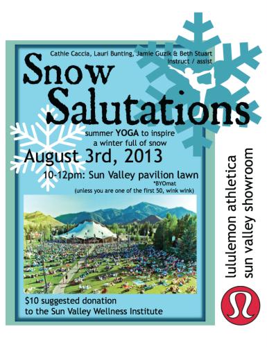 The Sun Valley Wellness Institute and lululemon athletica have teamed up to offer a unique new outdoor community yoga event in Sun Valley this summer – Sun Valley Snow Salutations . The event, to be held from 10am to 12noon on the lawn of the Sun Valley Pavilion on August 3, will offer a series of yoga classes taught by 4 renowned local yoga teachers and lululemon ambassadors.