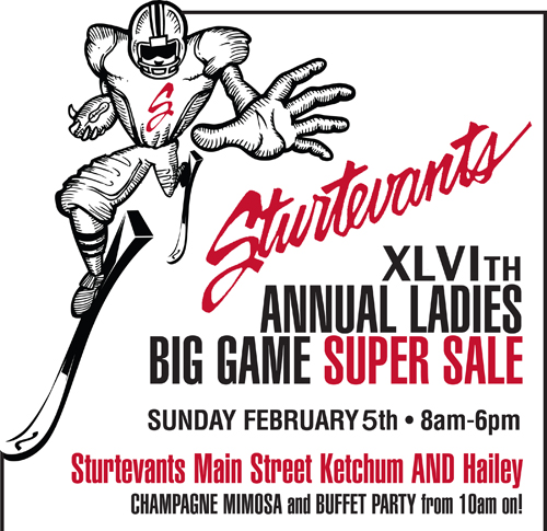XLVI Annual Ladies Big Game Super Sale at Sturtevants in Ketchum and Hailey! 8am-6pm This is THE biggest sale of the season! Great buys on ski equipment, clothing, accessories and more. Champagne mimosas and buffet party from 10am on.